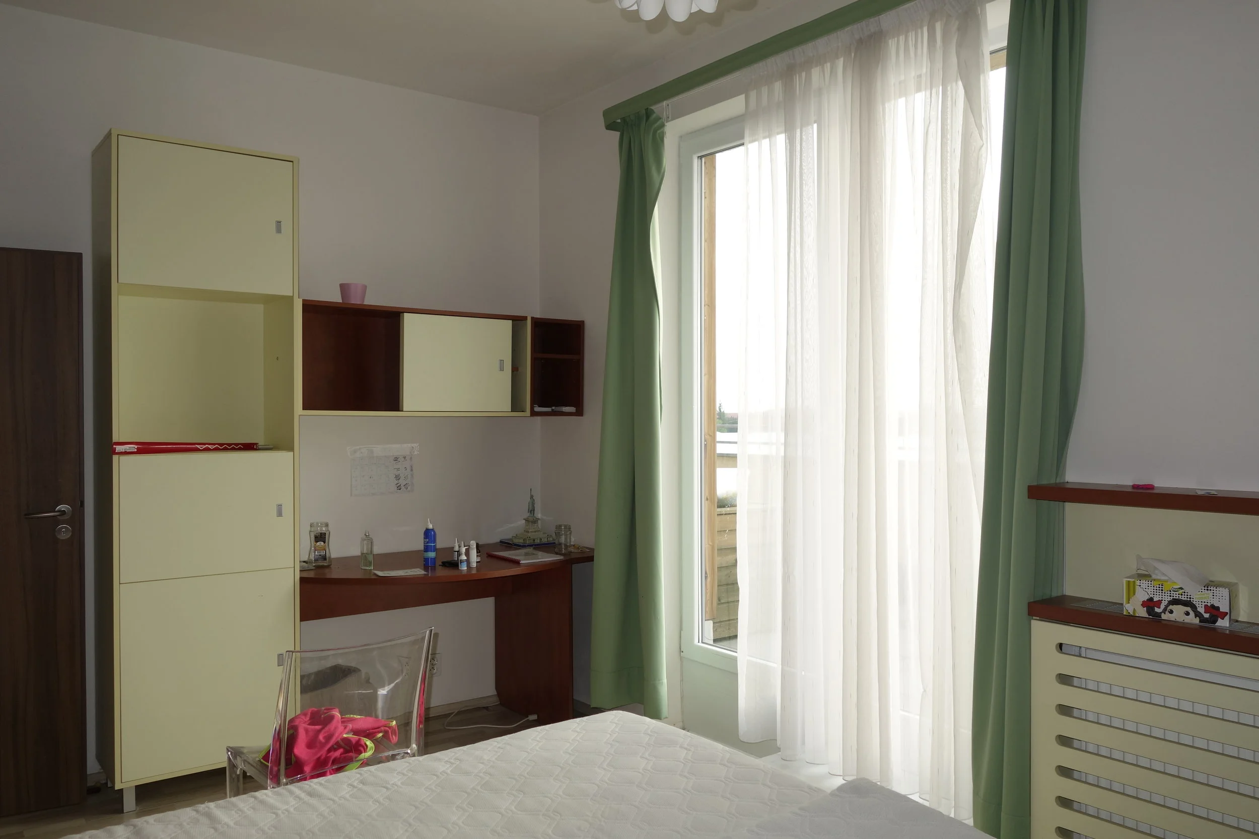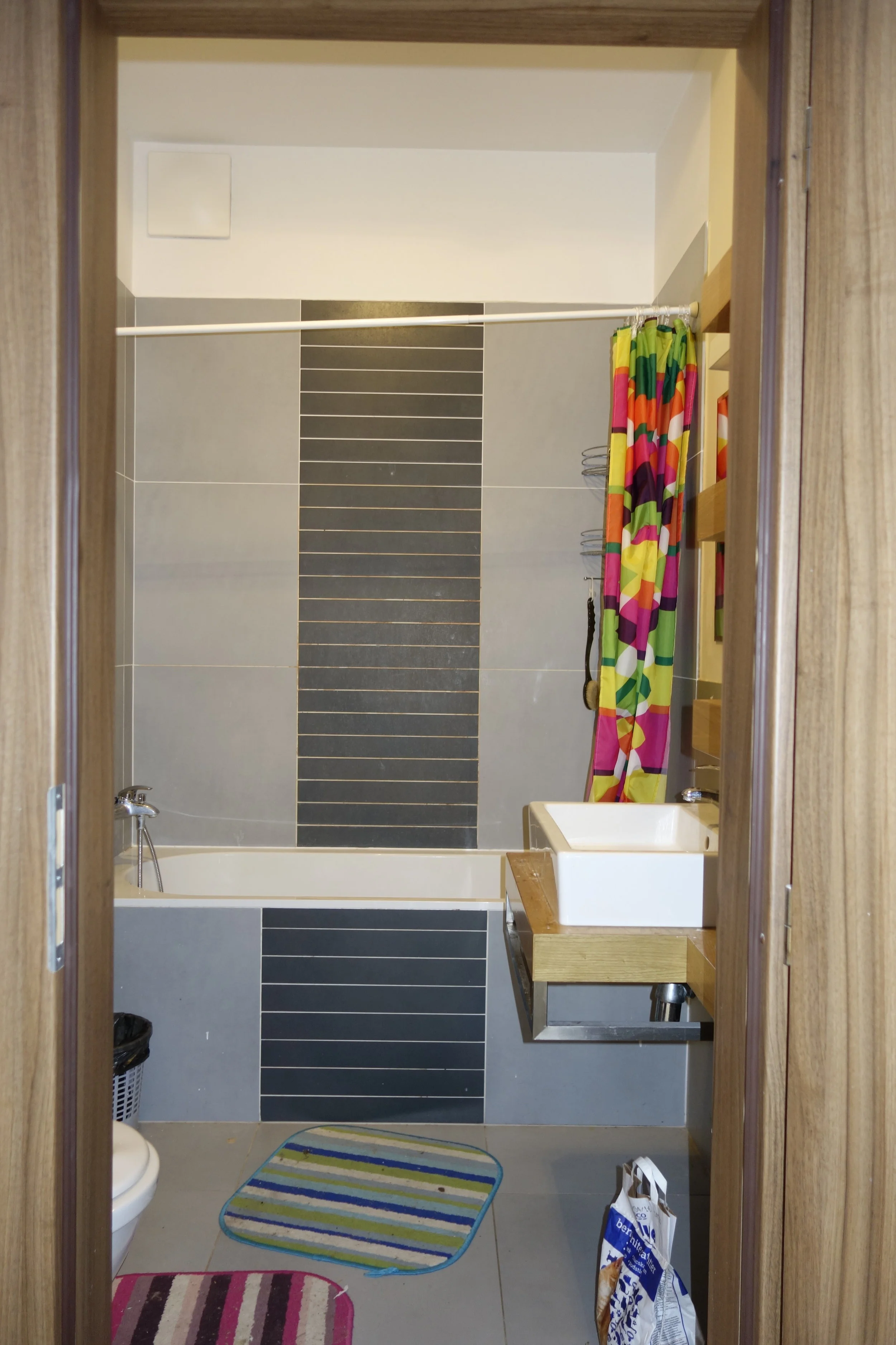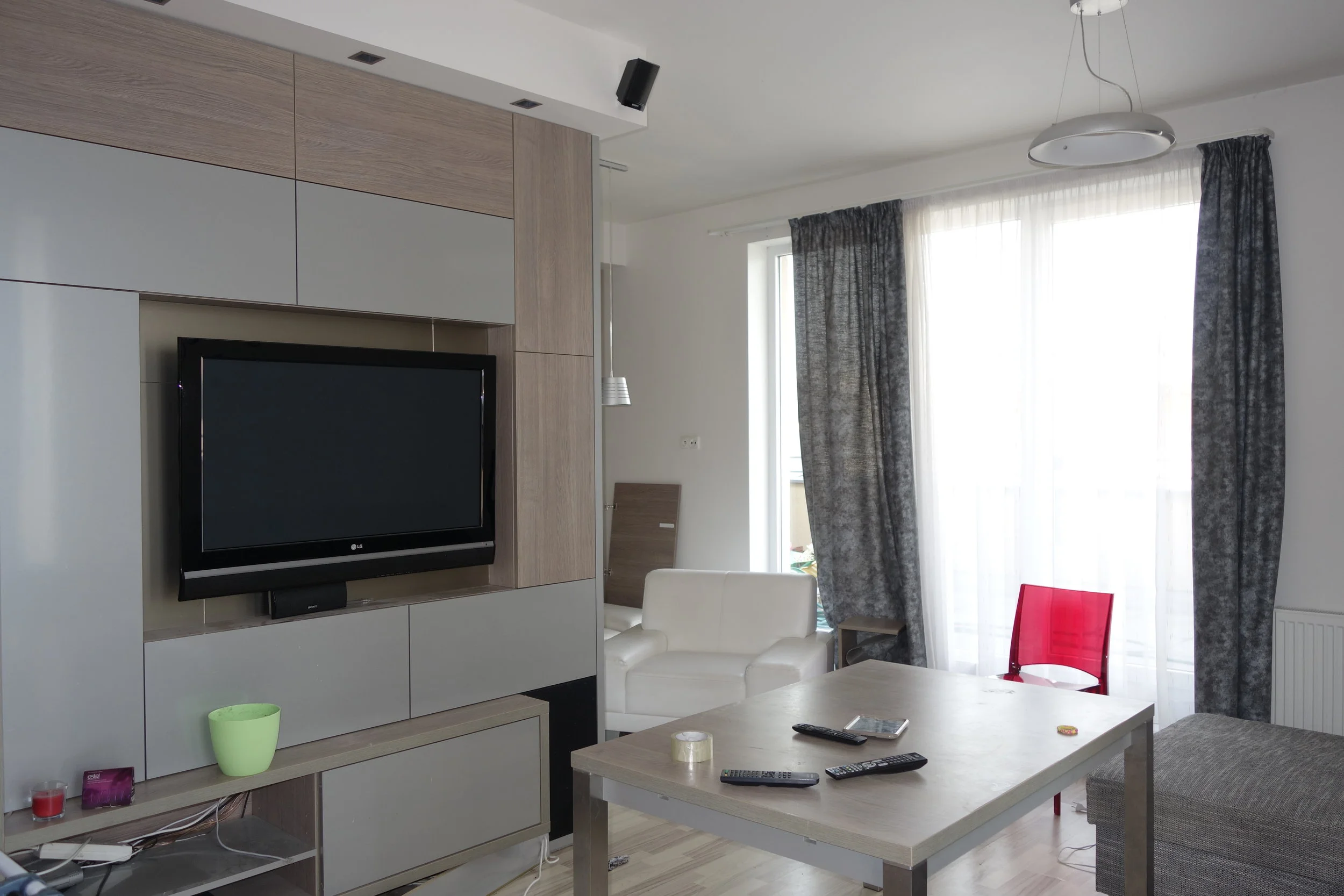 Celý byt byl vybaven nábytkem na míru, který byl ale z větší části po posledních nájemnících poničený. Abychom vyzvedly potenciál této nemovitosti, rozhodly jsme se, že byt se bude nabízet jako částečně vybavený. Ponechali jsme pouze kuchyňskou linku a TV stěnu, která na kuchyňskou linku navazuje.
