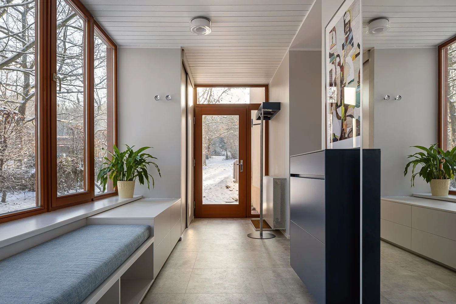 Barevné schéma interiéru je decentní. Teplejší zemité tóny, odstíny šedé, béžové v kombinaci se dřevem umocňují dojem elegance a prostornosti. Barevně i zařízením se zde nachází co nejméně rušivých elementů. Z původního vybavení jsme ponechali pouze knihovnu a skleník, kterému jsme pořídili nové moderní úchytky od firmy Monobrand. Prostor předsíně a chodby oživují odstíny modré. Výrazným prvkem interiéru jsou obrazy. Velký obraz nad pohovkou od Radka Šmacha ve světle modrých odstínech dodává místnosti svěžest.